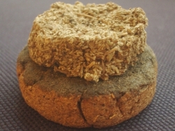 漢方薬を練り上げ乾燥させた「餅」にモグサをのせます。